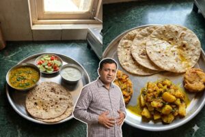 सबसे आम और सबसे बड़ी गलती है – ज्यादा रोटी खाना। बहुत से लोग सोचते हैं: “सब्जी थोड़ी है, रोटी और ले लेते हैं” “रोटी तो हल्की होती है”। दिनभर में कितनी रोटियाँ खानी चाहिए? ज्यादातर लोग सुबह नाश्ते में 2, दोपहर में 3-4 और रात में 3 रोटियाँ खा लेते हैं, कुल 8-9 तक। यह मात्रा बहुत ज्यादा है।